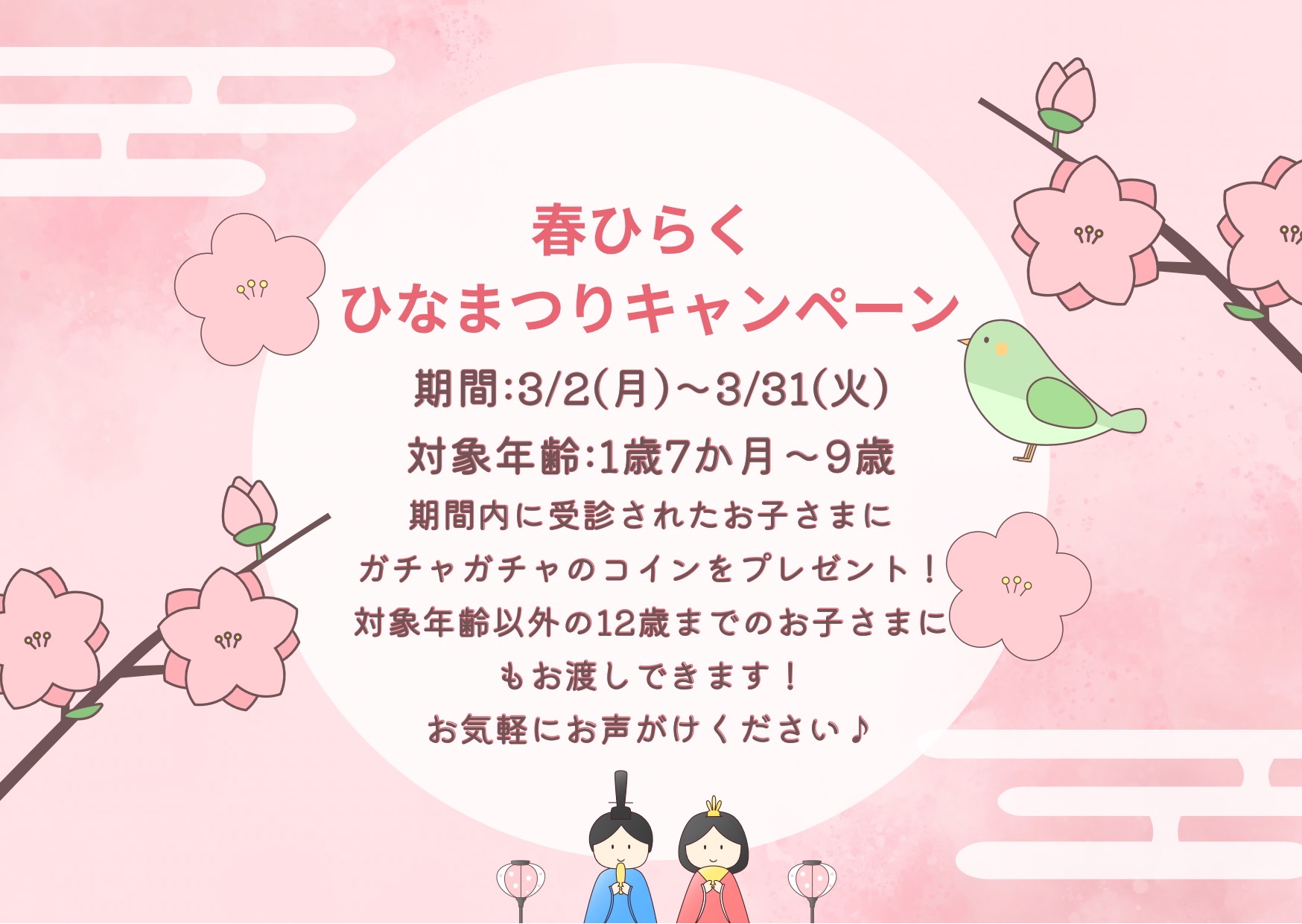 新着情報(詳細) 1月ガチャイベント継続中〜♪ (2025-12-26) 「HAPPY NEW YEARお年玉キャンペーン」1月もガチャガチャイベントを開催します♪ 期間:1月5日(月)〜1月31日(土) 対象:1歳7ヶ月から9歳の期間中に受診されたお子様※対象年齢以外の方でも12歳までのお子様にはお渡しできますのでご希望の方はお声がけください♪院内での感染対策(定期的な消毒・換気等)をしっかり行っておりますので、安心してご受診ください???? 一覧へ戻る